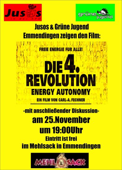 Am 25.11.2010 veranstalten unsere Kreisjusos ihr "Ökokino" mit der Grünen Jugend. Ab 19:00 Uhr wird der Film "Die 4. Revolution Energy Autonomy" im Mehlsack, Emmendingen gezeigt.